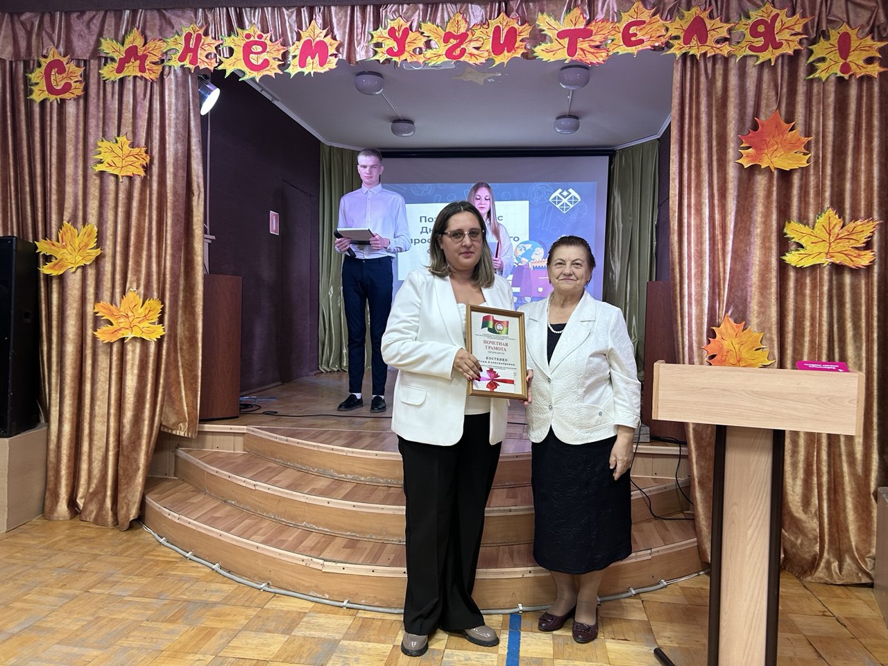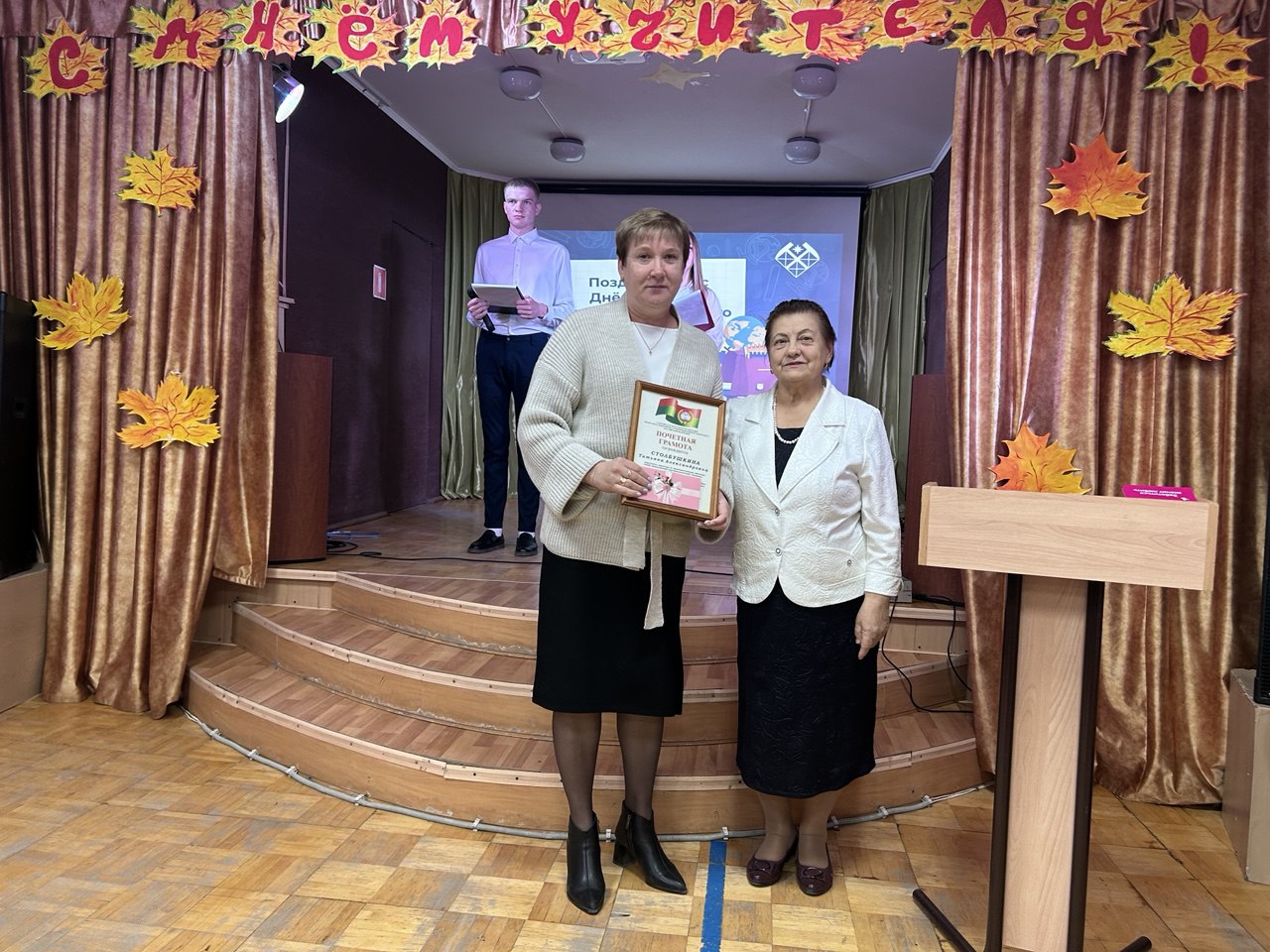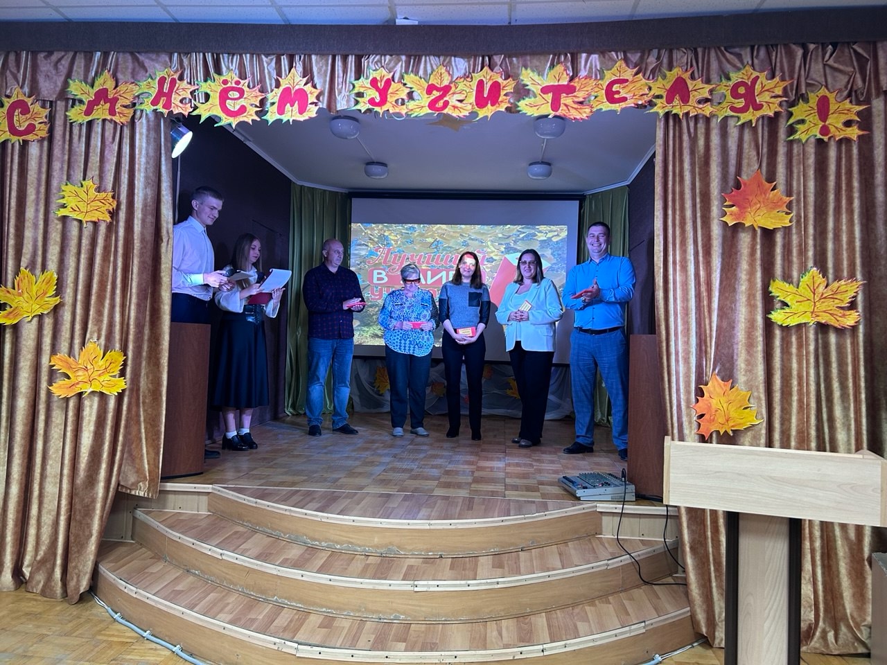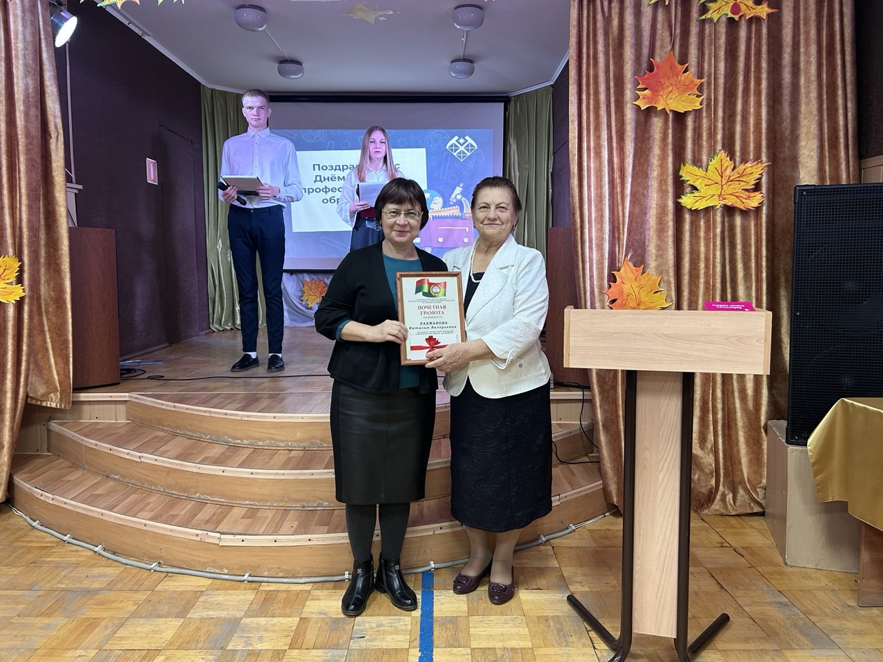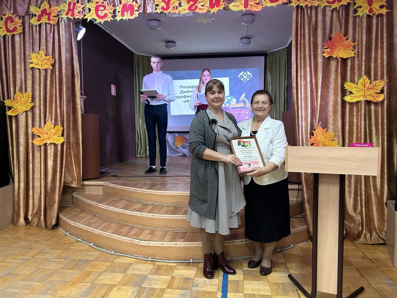 Открыла праздник и обратилась к присутствующим с поздравлениями Т.А. Столбушкина, заместитель директора по производственному обучению, которая поздравила всех собравшихся с праздником, пожелав вдохновения, терпения, настойчивости в покорении новых профессиональных вершин. Далее слово было предоставлено председателю профсоюзного комитета Л.В. Тарасовой, она также поздравила всех и вручила Почетные грамоты Саратовской областной организации профсоюза работников агропромышленного комплекса Российской Федерации членам Профсоюза нашего учебного заведения: Гуевой Т.Г., Рахмановой Н.В., Китаевой С.В., Костенко Ю.А., Столбушкиной Т.А., Прозорову В.И. — за добросовестный труд, содействие профсоюзному движению в Год 120-летия Профсоюзов России, в связи с 85-летием системы среднего образования и праздником — Днем учителя. Преподавателям и мастерам производственного обучения- Образцову С.А., Беспятову А.Н., Демидову П.П., Пойманову С.Н., Синицыну С.В., Гуртуеву В.И., Морозову В.А.- как юбилярам по стажу работы в нашем учебном заведении были вручены Подарочные сертификаты от Профсоюза.