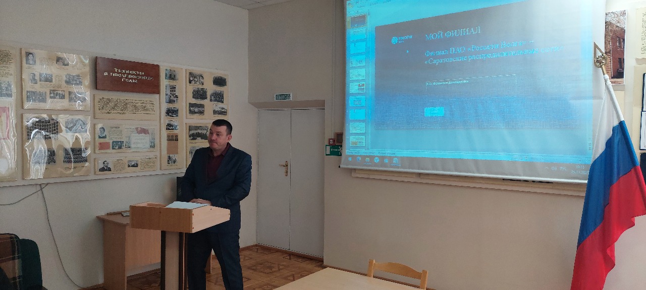 В рамках работы Центра карьеры образовательной организации 24 ноября состоялась встреча студентов по специальности «Эксплуатация и ремонт сельскохозяйственной техники и оборудования» и по профессии «Мастер по ремонту и обслуживанию автомобилей» с главным инженером Новоузенских районных электрических сетей филиала ПАО «Россети-Волга» - «Саратовские распределительные сети» Игнатьевым Н.С.