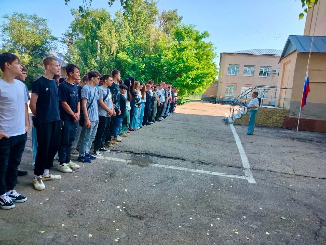 На календаре понедельник 16 июня! На линейку собрались студенты ГАПОУ СО "Новоузенский агротехнологический техникум. Право поднять флаг Российской Федерации, было предоставлено Мокриеву Александру, студенту группы ЭР-11, Победителю конкурса исследовательских работ "Время подвига", рассказывающих о героических подвигах наших выпускников - участников Специальной военной операции.